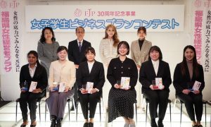 「女子学生ビジネスプランコンテスト」では、審査委員長に㈱Ri-speKtの栗林利紗さん、審査員に中小企業団体中央会の鈴木勉専務理事、㈱ケイリーパートナーズの鷲谷恭子さんをお迎えして審査が行われ、福島県が抱える様々な問題を解決すべく、斬新なアイデアいっぱいのビジネスプランを6名の女子学生の皆さんがはじける笑顔で元気に発表してくれました。